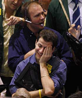 | 圖為交易員在美國紐約商品交易所中工作。由于市場擔心次貸危機繼續(xù)惡化,12日紐約股市全面下跌。新華社/法新 | 歐美投行次貸損失浮出水面