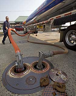 | 圖為美國(guó)弗吉尼亞的一座加油站,一名汽油運(yùn)輸司機(jī)正向加油站輸油。本報(bào)資料照片 | 高油價(jià)抑制需求效應(yīng)顯現(xiàn)
