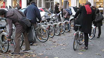 14日,巴黎市民在街頭取用市政府出租的公共自行車。由于公共交通系統(tǒng)的工人罷工,自行車成為巴黎上班族的重要交通工具。
