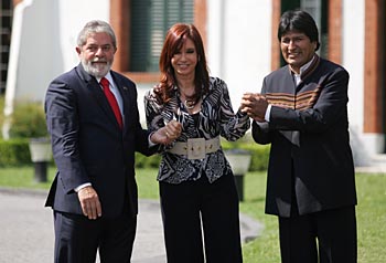 | 23日,阿根廷總統(tǒng)克里斯蒂娜(中)同到訪的巴西總統(tǒng)盧拉(左)和玻利維亞總統(tǒng)莫拉萊斯在布宜諾斯艾利斯舉行會晤。三國總統(tǒng)決定成立一個部長級工作小組,協(xié)調(diào)這三個南美洲國家的能源政策。新華社發(fā)(馬丁·薩巴拉