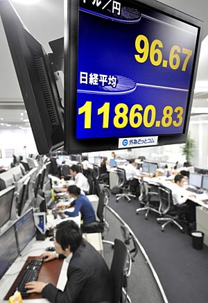由于投資者預(yù)期美聯(lián)儲即將降息,近來美元對多數(shù)西方其他主要貨幣比價持續(xù)下跌,17日東京外匯市場早盤歐元兌美元一度升至1比1.5905,為歷史最高紀(jì)錄。同時,美元兌日元比價一度跌至1比95.75,是1995年9月以來新低。午盤后,日元多頭獲利回吐,美元兌日元尾盤企穩(wěn)于1比97.3。 受此影響,14日紐約股市三大股指曾全部下跌,且跌幅皆超過1.5%,其中道瓊斯指數(shù)下跌近200點。17日,東京股市日經(jīng)225股指受日元急劇升值影響大幅下挫454點,大盤一度跌穿11700點。其后,受匯市日元升勢趨緩等因素影響,盤面跌勢有所緩和,日經(jīng)股指小幅反彈,最終以11787.51點報收,跌幅為3.71%。 |