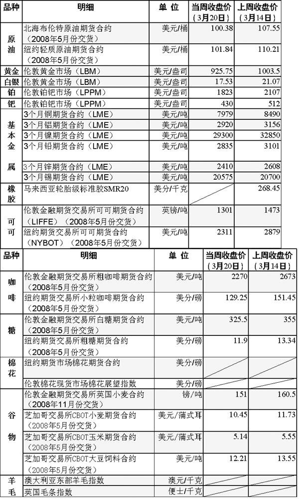 當(dāng)周大宗商品市場(chǎng)呈現(xiàn)戲劇性變化。周一(17日)、周二(18日)延續(xù)前幾周行情走勢(shì),油價(jià)、金價(jià)均創(chuàng)歷史新高;但周三(19日)、周四(20日)各市場(chǎng)行情紛紛出現(xiàn)大逆轉(zhuǎn),其逆轉(zhuǎn)態(tài)勢(shì)同樣創(chuàng)出了多年來(lái)的單日或單周最大跌幅。周五(21日)為復(fù)活節(jié)假期,美國(guó)及歐洲金融市場(chǎng)均休市一天。 在原油市場(chǎng),紐約原油期貨17日盤(pán)中創(chuàng)出每桶111.80美元的歷史新高。此后,受美國(guó)上周原油庫(kù)存增加以及美聯(lián)儲(chǔ)降息幅度不及部分市場(chǎng)人士預(yù)期等因素影響,19日原油期貨價(jià)格每桶急跌近5美元,創(chuàng)下17年來(lái)的最大單日跌幅;20日更是一度跌至100美元以下,收盤(pán)時(shí)回漲至每桶101.84美元。 在黃金市場(chǎng),繼前一周突破每盎司1000美元大關(guān)后,17日紐約市場(chǎng)黃金價(jià)格再次創(chuàng)下每盎司1033.9美元的歷史最高紀(jì)錄(當(dāng)日收盤(pán)于1002.60美元)。不過(guò),19日金價(jià)卻比前一個(gè)交易日每盎司直線下跌60.80美元,收于943.50美元,單日跌幅達(dá)6.1%。20日繼續(xù)下跌,收于每盎司920美元,一周內(nèi)金價(jià)共下跌8%,為1990年8月份以來(lái)的單周最大跌幅。分析師杰姆斯·摩爾指出,金價(jià)走低主要是受到美元匯率回升的影響。由于美聯(lián)儲(chǔ)降息幅度不及投資者預(yù)期,美元匯率受到一定支撐,這削弱了黃金作為避險(xiǎn)保值工具的吸引力,造成金價(jià)大幅下跌。 白銀、銅等金屬價(jià)格當(dāng)周走勢(shì)與黃金類似。其中,白銀、銅的價(jià)格一周跌幅分別達(dá)到18%和6.6%。類似的回調(diào)行情同樣發(fā)生在小麥、大豆等谷物期貨市場(chǎng)上。 分析人士稱,商品期貨價(jià)格的大幅跳水反映出市場(chǎng)對(duì)美國(guó)經(jīng)濟(jì)衰退的擔(dān)憂在日益加劇。最近幾周來(lái),次貸危機(jī)對(duì)美國(guó)實(shí)體經(jīng)濟(jì)的真正影響開(kāi)始顯現(xiàn),并逐步體現(xiàn)為市場(chǎng)對(duì)原材料的需求減少。而美國(guó)經(jīng)濟(jì)對(duì)能源、金屬、農(nóng)產(chǎn)品等原材料需求的下跌,必然在長(zhǎng)期內(nèi)導(dǎo)致這些商品價(jià)格的下跌。