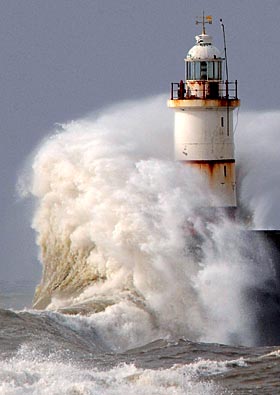 | 在英國英格蘭南部的薩塞克斯,巨浪拍打著堤岸邊的燈塔。新華社/路透 | 新裝置