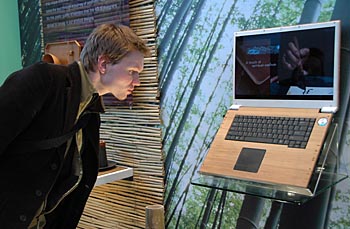 | 3月4日,在德國漢諾威信息及通信技術(shù)博覽會上,一名參觀者仔細觀看華碩電腦公司展示的部分用竹子做成的筆記本電腦。新華社記者