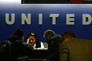 | 圖為美國聯(lián)合航空公司的工作人員在接待旅客。新華社記者 侯俊
