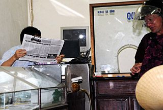 | 13日,在越南首都河內(nèi)市河中街一家外匯代理店,工作人員正在讀報(bào)。越南國(guó)家銀行近日出臺(tái)新規(guī)定加強(qiáng)了對(duì)外匯市場(chǎng)的監(jiān)控,使自由市場(chǎng)大部分外匯代理店生意日漸蕭條。本報(bào)記者