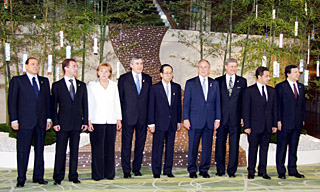 | 7日,在日本北海道洞爺湖,參加八國集團首腦會議的領導人在竹子裝飾前合影,從左至右依次為意大利總理貝盧斯科尼、俄羅斯總統(tǒng)梅德韋杰夫、德國總理默克爾、英國首相布朗、日本首相福田康夫、美國總統(tǒng)布什、加拿大總理哈珀、法國總統(tǒng)薩科齊和歐盟委員會主席巴羅佐。新華社發(fā) | 八國集團(G8)領導人8日在日本北海道洞爺湖舉行第二天的閉門工作會議,并在會后發(fā)表聲明,就共同關心的問題表明了立場。聲明涉及溫室氣體減排、能源價格飆升、多哈回合談判和“海利根達姆進程”等若干熱點問題。
