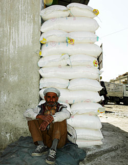 | 7月6日,一名搬運(yùn)工在阿富汗首都喀布爾的一個(gè)面粉市場里休息。在全球糧食價(jià)格飆升的背景下,阿富汗人的主食面粉的價(jià)格也較去年大漲,使很多普通阿富汗人的生活更加艱辛。新華社記者