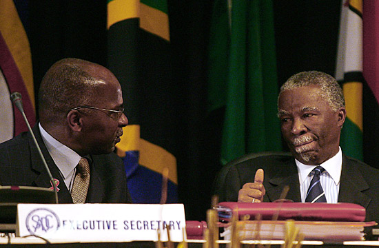 | 17日,在南非約翰內(nèi)斯堡舉行的南部非洲發(fā)展共同體(南共體)首腦會議上,南共體執(zhí)行秘書長薩洛芒(左)和南非總統(tǒng)姆貝基交談。新華社/法新 |