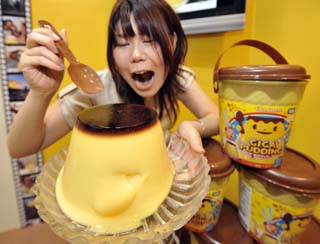 3日,在日本東京國(guó)際禮品展上,日本Tomy玩具公司員工展示一個(gè)布丁造型的玩具。這款玩具將于10月份在日本上市。近年來(lái),以各種食品為造型的仿真玩具在日本暢銷(xiāo)。
