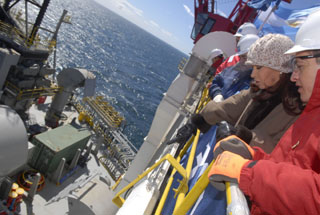 6日,阿根廷總統(tǒng)克里斯蒂娜·費爾南德斯(右二)在阿根廷南方丘布特省視察一座當(dāng)天正式啟用的海上石油勘探鉆井平臺,該平臺的使用標(biāo)志著阿根廷在時隔30年后重新啟動海上石油探勘工程。