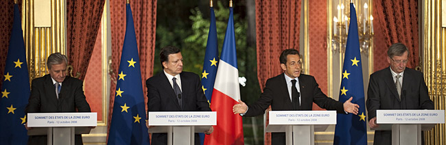| 圖為12日,在法國(guó)首都巴黎,(從左至右)歐洲中央銀行行長(zhǎng)特里謝、歐盟委員會(huì)主席巴羅佐、歐盟輪值主席國(guó)法國(guó)總統(tǒng)薩科齊和歐元集團(tuán)主席、盧森堡首相容克出席聯(lián)合新聞發(fā)布會(huì)。歐元區(qū)15國(guó)領(lǐng)導(dǎo)人當(dāng)天在巴黎召開的首腦會(huì)議上通過一項(xiàng)行動(dòng)計(jì)劃,同意由各國(guó)政府為銀行再融資提供擔(dān)保并向銀行注資,以共同應(yīng)對(duì)當(dāng)前的金融危機(jī)。新華社/路透 |