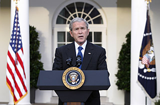 | 14日,美國總統(tǒng)布什在華盛頓白宮發(fā)表講話。布什當(dāng)天宣布,作為7000億美元救市計劃的具體舉措,政府將動用其中的2500億美元直接購買金融機構(gòu)股份,以此促進金融市場恢復(fù)運轉(zhuǎn)。新華社/路透 | 本報紐約電