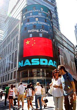 | 圖為2008年8月8日,在美國紐約時報廣場,納斯達(dá)克公司在其戶外大屏幕上打出慶祝北京奧運會開幕的畫面。新華社記者