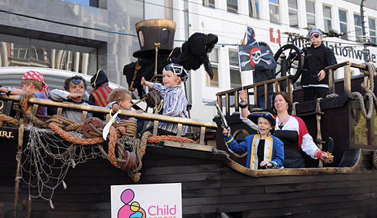 16日,在新西蘭首都惠靈頓,參加游行的“海盜”花車駛過街頭。當(dāng)天,惠靈頓市政府舉辦一年一度的圣誕大巡游活動,當(dāng)?shù)孛癖娂娂娪可辖诸^,享受明媚陽光,感受圣誕氣氛。