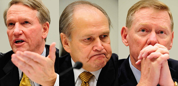 | 這張拼接的照片顯示,11月19日,在美國(guó)華盛頓國(guó)會(huì)山,美國(guó)通用汽車公司首席執(zhí)行官瓦格納(左一)、克萊斯勒汽車公司首席執(zhí)行官納爾代利和福特汽車公司首席執(zhí)行官穆拉利(右一)出席眾議院就美國(guó)汽車工業(yè)救援方案舉行的聽證會(huì)。新華社記者