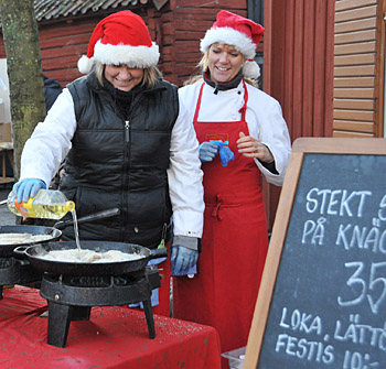 21日,在瑞典首都斯德哥爾摩附近的小鎮(zhèn)錫格蒂納,兩位婦女在圣誕節(jié)露天市場上制作當?shù)仫L味小吃。瑞典各地都有在圣誕節(jié)前夕開設(shè)露天市場的傳統(tǒng)。在這種露天圣誕節(jié)市場上,居民不僅可以買到圣誕節(jié)商品,而且還能品嘗到當?shù)仫L味小吃,節(jié)日氣氛非常濃郁。