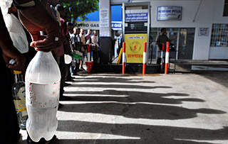 | 在斯里蘭卡首都科倫坡,人們手持各種容器在加油站排隊買汽油。新華社發(fā) |