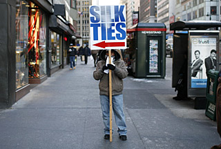 | 23日,一名男子在美國(guó)紐約市的街頭手持銷(xiāo)售領(lǐng)帶的標(biāo)牌。美國(guó)市場(chǎng)調(diào)查公司ShopperTrak RCT公司24日發(fā)表統(tǒng)計(jì)數(shù)據(jù)顯示,美國(guó)零售商店今年圣誕節(jié)前周末客流量較去年同期下滑24%,今年年底可能是40年來(lái)最暗淡的一個(gè)銷(xiāo)售季。新華社/路透 | 24日平安夜,各處商家店鋪提早關(guān)門(mén),今年的圣誕節(jié)購(gòu)物季也宣告結(jié)束。在金融危機(jī)的沖擊下,美國(guó)人的圣誕消費(fèi)悄然發(fā)生變化——紛紛過(guò)起了“緊日子”,更加精打細(xì)算,盡量減少購(gòu)物預(yù)算。零售商的日子不太好過(guò)。不過(guò)有分析家預(yù)測(cè)今年的節(jié)后銷(xiāo)售要熱過(guò)往年。