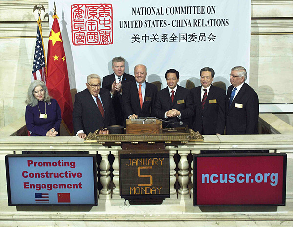 5日,在美國(guó)紐約證券交易所,美中關(guān)系全國(guó)委員會(huì)會(huì)長(zhǎng)歐倫斯(左四)、中國(guó)常駐聯(lián)合國(guó)代表張業(yè)遂(右三)、美國(guó)前國(guó)務(wù)卿基辛格(左二)等參加慶祝中美建交30周年紀(jì)念儀式。