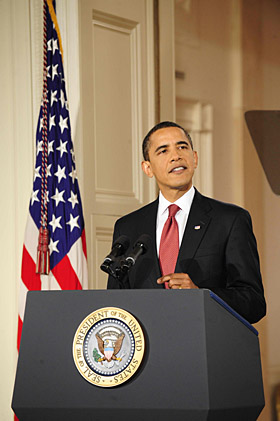 | 9日,美國(guó)總統(tǒng)奧巴馬在白宮舉行就職以來(lái)的首場(chǎng)新聞發(fā)布會(huì)。新華社記者 張巖