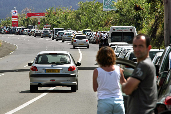 14日,在法屬馬提尼克島,等候加油的車輛排成長隊。加勒比海地區(qū)的瓜德魯普、馬提尼克等法國海外領地上月以來發(fā)生罷工和示威游行,抗議物價上漲并要求增加工資,近日事態(tài)已經(jīng)升級并發(fā)生騷亂,許多商店和加油站關門。法國已從本土派遣防暴警察赴這兩個海外領地維持秩序。新華社/法新