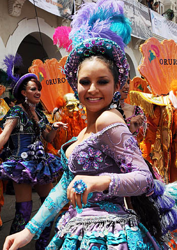 21日,在玻利維亞西南部奧魯羅省首府奧魯羅市街頭,姑娘們身著艷麗服裝參加狂歡節(jié)表演。著名的玻利維亞奧魯羅狂歡節(jié)是南美地區(qū)最具特色的狂歡節(jié)之一,每年都吸引數(shù)十萬人前來觀看。新華社發(fā)
