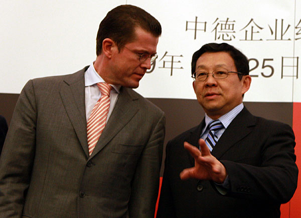 | 25日,中國(guó)商務(wù)部長(zhǎng)陳德銘(右)和德國(guó)經(jīng)濟(jì)部長(zhǎng)古滕貝格在柏林德國(guó)工業(yè)聯(lián)合會(huì)總部舉行的“中德貿(mào)易投資論壇暨采購(gòu)項(xiàng)目簽約儀式”上交談。當(dāng)日,陳德銘率中國(guó)貿(mào)易投資促進(jìn)團(tuán)訪問(wèn)德國(guó)。陳德銘和古滕貝格共同出席了“中德貿(mào)易投資論壇暨采購(gòu)項(xiàng)目簽約儀式”,并分別發(fā)表演講。 | |