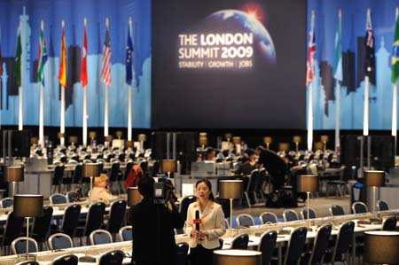 1日,在英國倫敦二十國集團金融峰會會場,中國記者在進行報道演練。新華社記者:曾毅