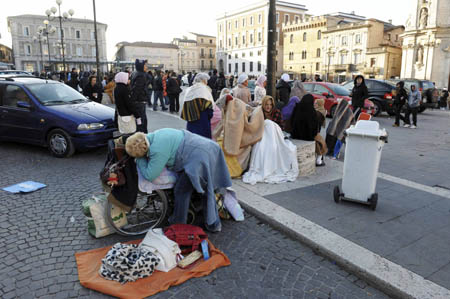6日,在意大利中部拉奎拉省,一些當(dāng)?shù)鼐用衽鹤釉趶V場(chǎng)上躲避可能來臨的余震。意大利中部地區(qū)6日凌晨發(fā)生強(qiáng)烈地震,造成重大人員傷亡和財(cái)產(chǎn)損失。