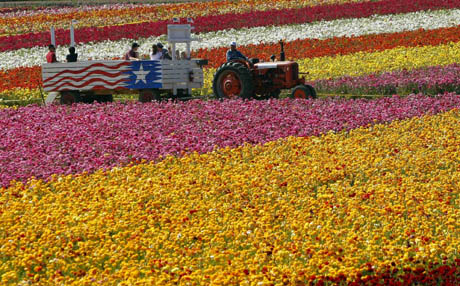 7日,在美國加利福尼亞州卡爾斯巴德一個(gè)花卉種植園,游客乘著拖拉機(jī)賞花。 新華社/路透