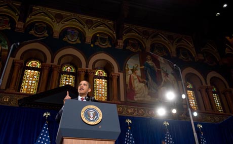 14日,美國總統(tǒng)奧巴馬在首都華盛頓喬治敦大學發(fā)表演講。新華社/法新