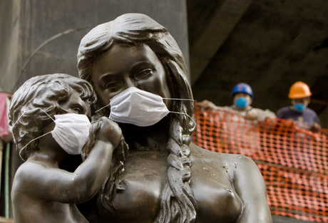 27日,為提醒人們嚴(yán)防豬流感疫情蔓延,墨西哥首都墨西哥城的一座雕塑被戴上口罩。新華社/法新 |