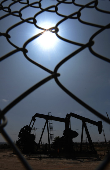 2009年5月12日在美國洛杉磯一個油田拍攝的工作中的機泵。新華社/法新 |