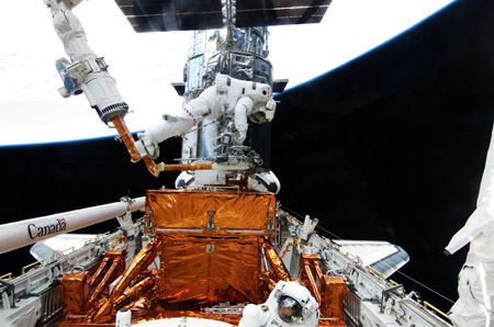 美國國家航空航天局5月18日發(fā)布的照片顯示,“阿特蘭蒂斯”號航天飛機宇航員邁克爾·馬西米諾和邁克爾·古德(左)在17日進行的第四次太空行走中維護哈勃太空望遠鏡。美國航天局18日發(fā)布消息說,“阿特蘭蒂斯”號航天飛機上的兩名宇航員安德魯·福伊斯特爾和約翰·格倫斯菲爾德當天進行太空行走為哈勃太空望遠鏡更換了三塊電池、一個恒星追蹤傳感器以及熱屏蔽罩,完成了對哈勃的最后一次維護工作!鞍⑻靥m蒂斯”號航天飛機于11日發(fā)射升空,機上的7名宇航員通過5次太空行走對哈勃望遠鏡進行了最后一次維護,為其更換了相機、電池、陀螺儀、對接環(huán)、光譜儀等設備。新華社/法新 |