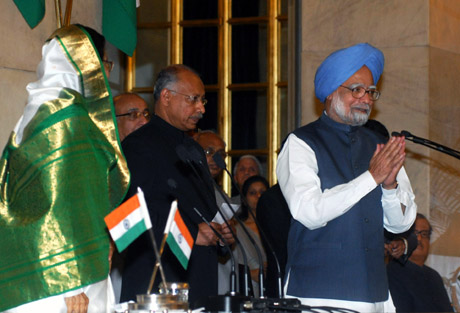22日,在印度首都新德里,連任的印度總理曼莫漢·辛格(右一)宣誓就職。當(dāng)日,以曼莫漢·辛格總理為首的新一屆印度政府在印度總統(tǒng)府正式宣誓就職。新華社發(fā) | 以總理辛格為首的印度新政府22日宣誓就職后,其內(nèi)外政策走向成為印度國(guó)內(nèi)外輿論關(guān)注的焦點(diǎn)。當(dāng)?shù)孛襟w普遍認(rèn)為,繼續(xù)拉動(dòng)本國(guó)經(jīng)濟(jì)發(fā)展將是印度新政府各項(xiàng)工作的重中之重。 在印度新一屆政府中,前外交部長(zhǎng)慕克吉出任財(cái)政部長(zhǎng),印度“硅谷”班加羅爾建造者之一、來(lái)自南方的前卡納塔克邦首席部長(zhǎng)克里希納出任外交部長(zhǎng)。慕克吉23日對(duì)媒體表示,保護(hù)印度經(jīng)濟(jì)免受國(guó)際經(jīng)濟(jì)衰退帶來(lái)的沖擊是新一屆政府的首要任務(wù),同時(shí)新政府將采取措施激活本國(guó)經(jīng)濟(jì),保持經(jīng)濟(jì)增長(zhǎng)?死锵<{在會(huì)見記者時(shí)表示,印度外交是為經(jīng)濟(jì)發(fā)展服務(wù)的,印度政府的目標(biāo)是在今后相當(dāng)長(zhǎng)的時(shí)間內(nèi)保持經(jīng)濟(jì)增長(zhǎng),做到這一點(diǎn)需要和平安寧的周邊環(huán)境和有利的國(guó)際環(huán)境。