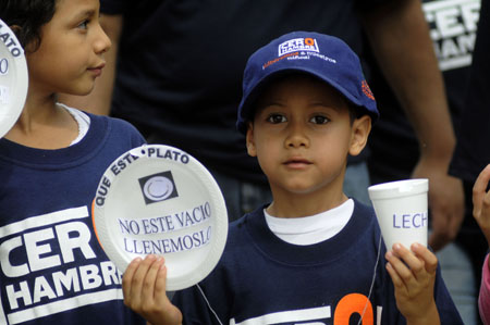 6月7日,在洪都拉斯首都特古西加爾巴,人們參加“零饑餓”大游行。當(dāng)天,特古西加爾巴市市民以“零饑餓”為主題進(jìn)行大規(guī)模游行,呼吁社會(huì)為消除饑餓和營(yíng)養(yǎng)不良做出貢獻(xiàn)。據(jù)悉,由于國(guó)內(nèi)糧食產(chǎn)量的持續(xù)下滑和中美洲糧食緊缺局面的加劇,目前洪都拉斯國(guó)內(nèi)34座城市出現(xiàn)糧食供應(yīng)問題,約有30萬(wàn)名年齡在5歲以下的兒童營(yíng)養(yǎng)不良,其中20萬(wàn)營(yíng)養(yǎng)不良兒童集中在相對(duì)貧瘠的洪都拉南部。目前,洪都拉斯政府正在尋求聯(lián)合國(guó)和中美洲鄰國(guó)的幫助,以求緩解國(guó)內(nèi)日益嚴(yán)重的糧食危機(jī)。 |