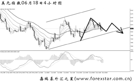 受上述因素影響,美元指數(shù)繼續(xù)維持在震蕩通道內(nèi)徘徊。從4小時圖上看,這次盤整整體為前方下跌的次要節(jié)奏,后市美元指數(shù)下行挑戰(zhàn)6月初低點78.30的概率較大。首先需關(guān)注通道下沿79.80的支撐作用,跌破后方可延續(xù)中線的跌勢。預(yù)計下周美元指數(shù)將以反彈后再度下挫的走勢為主。