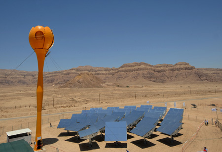 這是24日在以色列南部?jī)?nèi)蓋夫沙漠地區(qū)的薩瑪爾集體農(nóng)莊拍攝的太陽(yáng)能混合熱電站。當(dāng)日,以色列正式啟用這個(gè)世界上首個(gè)太陽(yáng)能混合熱電站。該電站通過(guò)30個(gè)能跟蹤太陽(yáng)的反射鏡將陽(yáng)光反射后集中在高塔接收器上,接收器將空氣加熱成高溫高壓蒸汽來(lái)推動(dòng)汽輪發(fā)電機(jī)發(fā)電。當(dāng)陽(yáng)光不充足時(shí),該電站可以用燃油、天然氣等其他能源發(fā)電。該電站發(fā)電功率為100千瓦,可以供給70戶家庭用電。 |