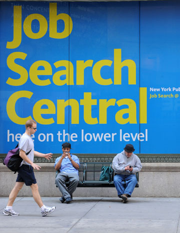 5月8日,一位男士從美國(guó)紐約公共圖書館擇業(yè)信息中心的巨幅宣傳廣告牌前經(jīng)過。新華社記者 申宏 攝 |