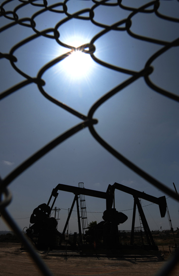 圖為2009年5月12日在美國洛杉磯一個(gè)油田拍攝的工作中的機(jī)泵。新華社/法新 |