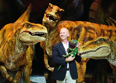 5日,在英國(guó)倫敦,藝術(shù)導(dǎo)演斯科特·法里斯站在恐龍模型中間。這個(gè)由法里斯導(dǎo)演的“與恐龍為伴”主題演出以15頭按照真實(shí)大小制作的機(jī)械恐龍?jiān)佻F(xiàn)了遠(yuǎn)古時(shí)期的恐龍生存狀況,將持續(xù)到8月31日。新華社/路透