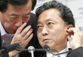 30日,日本最大在野黨民主黨黨首鳩山由紀(jì)夫(右)在眾議院大選開票現(xiàn)場。新華社記者:任正來