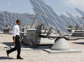美國總統(tǒng)奧巴馬提出的經(jīng)濟刺激計劃中,首要的就是發(fā)展可再生能源。5月27日,美國總統(tǒng)奧巴馬在拉斯韋加斯的內(nèi)利斯空軍基地視察太陽能電池板。新華社/路透
