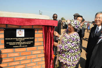 6月25日,在馬拉維的巴拉卡地區(qū),馬拉維副總統(tǒng)喬伊絲·班達(dá)(前中)為“中非棉業(yè)馬拉維棉花公司”揭牌。該項(xiàng)目總投資1900萬美元,是中國(guó)目前在非洲投資的最大農(nóng)業(yè)項(xiàng)目,將通過發(fā)展種子優(yōu)化、軋花、榨油、紡紗等,提升馬拉維的棉花加工水平。新華社記者 海明威 攝