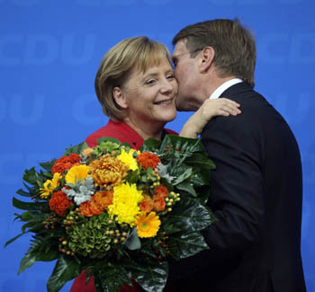 德國第17屆聯(lián)邦議院選舉結(jié)果27日晚揭曉,德國現(xiàn)任總理默克爾成功連任。默克爾宣布,由她領(lǐng)導(dǎo)的聯(lián)盟黨(由基民盟和基社盟組成)將與自民黨盡快組建新一屆德國政府。德國由大聯(lián)合政府更迭為大黨帶小黨的中右聯(lián)合政府,其經(jīng)濟(jì)政策走向值得人們關(guān)注。