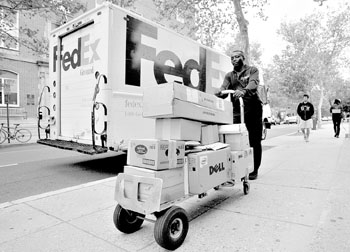 9月17日,美國聯(lián)邦快遞公司一名員工在華盛頓遞送快件。聯(lián)邦快遞公司當天發(fā)布的報告稱,受國際金融危機的影響,該公司的季度利潤下滑53%。新華社/路透 |
