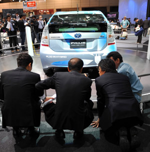 豐田汽車公司員工在日本東京車展上一輛展出的新型混合動力車后交談。新華社/法新 |