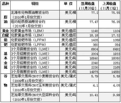 倫敦市場黃金期貨價(jià)18日盤中上沖至每盎司1152.85美元,刷新歷史最高紀(jì)錄。分析人士認(rèn)為,美元的疲弱態(tài)勢以及帶有官方性質(zhì)的黃金現(xiàn)貨買盤預(yù)期是推動國際金價(jià)頻創(chuàng)新高的主因。因?yàn)槊绹壳敖咏愕膭?chuàng)紀(jì)錄利率水平將在未來較長的一段時間內(nèi)保持不變,投資者對美元匯率未來走勢保持悲觀,此外通貨膨脹預(yù)期的不斷強(qiáng)化和股市連續(xù)下跌,也強(qiáng)化了投資者對黃金的保值需求。 當(dāng)周國際油價(jià)先漲后跌,但始終沒有突破每桶80美元大關(guān)。分析人士認(rèn)為,市場對全球經(jīng)濟(jì)復(fù)蘇可持續(xù)性的質(zhì)疑是油價(jià)未能再創(chuàng)新高的原因。在未來一段時間內(nèi),美元和股市的表現(xiàn)仍將繼續(xù)左右油價(jià),因?yàn)槿绻麊慰椿久,目前的疲弱需求狀況根本無法支撐現(xiàn)有油價(jià)。此前,石油輸出國組織(歐佩克)輪值主席、安哥拉石油部長德瓦斯康塞洛斯曾表示,國際油價(jià)應(yīng)保持在每桶80美元的水平,這是一個讓石油生產(chǎn)國和消費(fèi)國都能接受的價(jià)格。 倫敦市場基本金屬價(jià)格全線收高。業(yè)內(nèi)人士指出,近期資金的大規(guī)模流入將整個市場投資氛圍推向“白熱化”程度,導(dǎo)致金屬價(jià)格與基本面持續(xù)脫節(jié)。以銅期貨價(jià)為例,盡管當(dāng)前銅需求不振,倫敦金屬交易所銅庫存持續(xù)增加至41萬噸的7個月以來最高水準(zhǔn),但當(dāng)周銅價(jià)一度觸及每噸6992美元的高位。 當(dāng)周芝加哥期貨交易所谷物期貨價(jià)均呈現(xiàn)不同程度的上漲。除外部市場因素外,強(qiáng)勁的國際市場需求也是推動大豆價(jià)格收高的主要動力。美國農(nóng)業(yè)部當(dāng)周公布的周度農(nóng)產(chǎn)品出口銷售報(bào)告顯示,截至11月12日前一周,美國凈出口大豆134.97萬噸,遠(yuǎn)超市場預(yù)估區(qū)間的上限。而玉米價(jià)格的走高則同不良天氣狀況有關(guān)。氣象預(yù)報(bào)顯示,在經(jīng)過數(shù)天的良好天氣之后,近期美國中西部玉米帶將再次迎來潮濕天氣,這令市場對玉米的收割進(jìn)度再起憂慮。