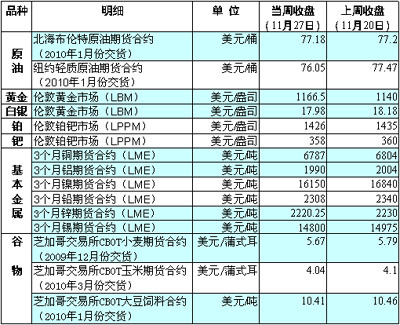 國(guó)際貨幣基金組織(IMF)25日宣布向斯里蘭卡央行出售了10噸黃金,該消息刺激倫敦市場(chǎng)黃金期貨價(jià)格次日上沖至每盎司1195.13美元的歷史新高,逼近1200美元關(guān)口。據(jù)傳,印度正考慮向IMF增購(gòu)黃金。分析人士認(rèn)為,由于目前各國(guó)央行尋求外匯儲(chǔ)備多元化的意愿仍很強(qiáng),可能會(huì)購(gòu)買(mǎi)更多黃金,因此12月的金價(jià)可能繼續(xù)上升。美國(guó)費(fèi)爾法克斯公司分析師約翰·邁耶說(shuō),央行及其他投資者需求可能推動(dòng)金價(jià)在未來(lái)3到6個(gè)月漲至每盎司1500美元。 受美元匯率波動(dòng)等因素影響,當(dāng)周?chē)?guó)際油價(jià)震蕩走低。尤其是受迪拜世界公司巨額債務(wù)違約的消息拖累,27日紐約市場(chǎng)油價(jià)一度跌至每桶72.39美元的低位,跌幅超過(guò)7%。俄羅斯副總理兼財(cái)政部長(zhǎng)庫(kù)德林25日說(shuō),美元走軟推動(dòng)了石油價(jià)格上漲,最近油價(jià)仍有望保持每桶70美元至80美元的水平,并在短期內(nèi)可能出現(xiàn)進(jìn)一步上漲,但隨后兩年間將可能出現(xiàn)下跌。 庫(kù)存大增打壓倫敦市場(chǎng)基本金屬價(jià)格。本周倫敦金屬交易所(LME)的鎳庫(kù)存增加了2000噸,至13.5萬(wàn)噸,為1995年1月以來(lái)的最高水平。巴克萊資本公司的研究報(bào)告指出,目前所有LME的金屬庫(kù)存水準(zhǔn)均高于其10月底水平。 當(dāng)周芝加哥期貨交易所農(nóng)產(chǎn)品期貨價(jià)格小幅下跌。除受外部市場(chǎng)因素影響外,玉米、大豆預(yù)期收割進(jìn)度加快也為市場(chǎng)帶來(lái)壓力。美國(guó)農(nóng)業(yè)部公布的報(bào)告顯示,截至11月22日的一周,美國(guó)玉米收割已經(jīng)完成68%,比前一周提高了14個(gè)百分點(diǎn);大豆收割已經(jīng)完成94%。美國(guó)小麥遭國(guó)際買(mǎi)家冷落,也進(jìn)一步增添了小麥?zhǔn)袌?chǎng)的做空氣氛。